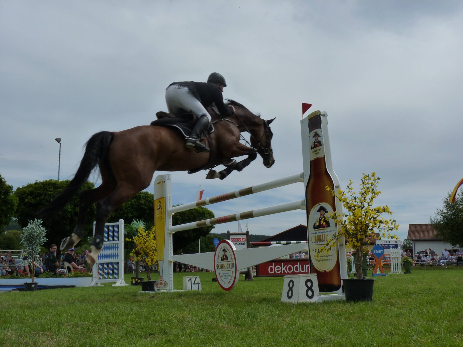 Bei herrlichem Sommerwetter gab es dann Hochspannung mit dem Mächtigkeitsspringen, das dieses Jahr gleich drei verdiente Sieger fand. Mit fünf Teilnehmern ging es bei einer Mauerhöhe von 2,05m in das vierten und entscheidende Stechen. Dabei zeigte Christian Kuhn bei seinem ersten Start mit El-Bandy 4 in dieser Klasse dass in Zukunft mit ihm als Sieganwärter zu rechnen ist. Den Preis der Schmucker-Brauerei aus Mossautal überreichte Gebietsver- kaufsleiter Gerhard Bönisch.