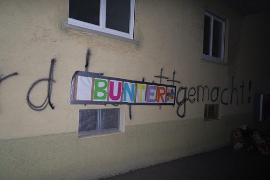 Zwischen vergangenem Freitag und Dienstagmorgen haben ebenfalls noch Unbekannte vermutlich mit Sekundenkleber das Eingangsschloss des als Asylunterkunft vorgesehenen Hauses unbrauchbar gemacht. Dabei entstand Sachschaden in Höhe von etwa 40 Euro. Die Polizei in Böckingen hat die Ermittlungen wegen den Sachbeschädigungen aufgenommen. Eine fremdenfeindliche Motivation für die Taten liegt aufgrund der bisherigen Umstände nahe. Im Rahmen der täglichen Streifenfahrten zeigt die Polizei verstärkt Präsenz an der Örtlichkeit. Am späten Donnerstagabend konnten Polizeibeamte, die die Gebäude bestreiften entdecken, dass Unbekannte auf das Wort „not“ einer ursprünglich „You are not welcome“ lautenden Parole ein großes weißes Plakat geklebt hatten, das in der Mitte ein großes, rotes Herz zeigt. Bei einer erneuten Streifenfahrt in den frühen Morgenstunden stellten die Beamten am Freitag fest, dass ein weiterer gesprayter Spruch verändert worden war. Unbekannte hatten das Wort „kaputt“ in der Parole „Dieses Land wird kaputt gemacht“ mit dem Wort „bunter“ überklebt.