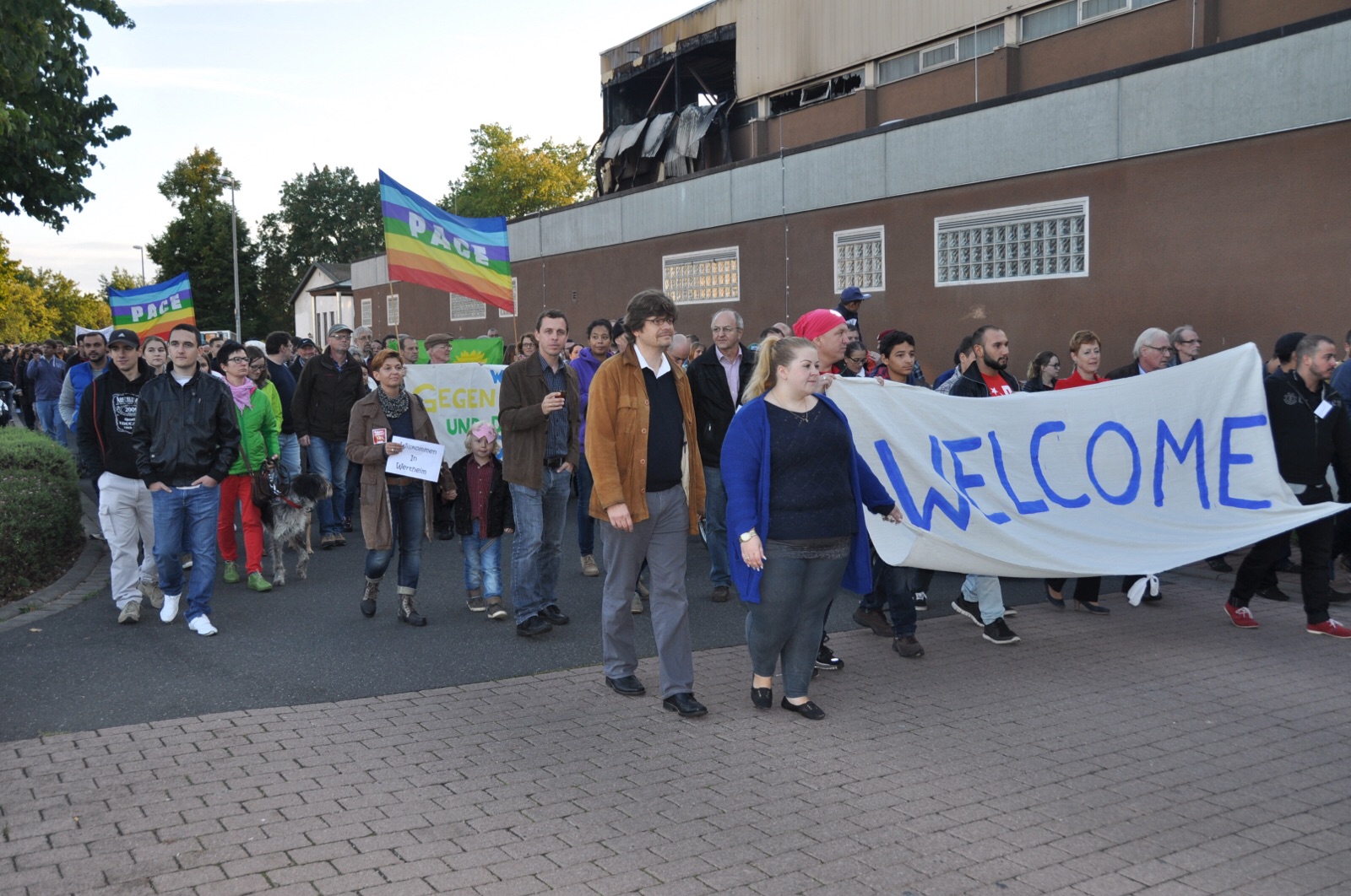 Von der unmittelbar neben der Turnhalle liegenden Michaeliskirche läutete die Glocke, eine Schweigeminute folgte. Oberbürgermeister Stefan Mikulicz dankte allen Anwesenden und appellierte, im Engagement für Flüchtlinge über den Tag hinaus nicht nachzulassen. Am Tor der Polizeiakademie wurden die Demonstranten von den dort untergebrachten Flüchtlingen mit Beifall empfangen.