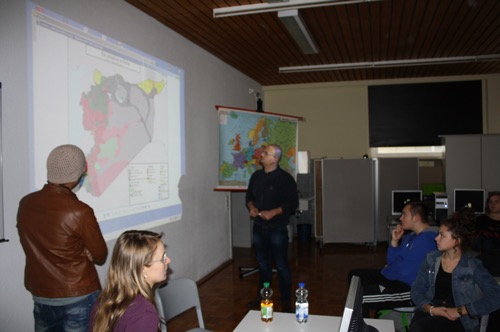 Nach einem kurzen geschichtlichen Abriss, der den Zuhörern das hohe kulturelle Niveau Syriens verdeutlichen sollte, stellten die Referenten mithilfe mehrerer Karten die Verteilung der verschiedenen ethnischen Gruppen in Syrien und die dort vorherrschenden Machtverhältnisse dar und konnten anhand aktuellster Karten deutlich machen, wie schnell sich im aktuell herrschenden Bürgerkrieg die Machtverhältnisse im Land verschieben. Nachdem im Anschluss genauer die Ursachen und die Gründe für den Ausbruch des Krieges beleuchtet worden waren, schilderten die beiden Syrer ihre Einzelschicksale samt Familiensituation, Flucht und das Leben in Adelsheim. Zum Abschluss blieb noch Zeit für Rückfragen der vollauf begeisterten und interessierten Schüler.