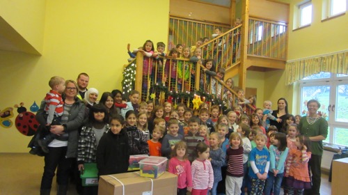 Großeicholzheim/Hardheim. (lm) Als schöne Großeicholzheimer Tradition, aber auch zur Freude der Kindergarten- und Grundschulkinder kommt an St. Martin nicht nur der Heilige Mann mit Geschenken, sondern es bewirtet an diesem Fest auch der Elternbeirat von Kindergarten und Grundschule, um einen sinnvollen Beitrag für einen guten Zweck leisten zu können. Also ganz im Sinne von St. Martin. In diesem Jahr stockten beide Institutionen den erwirtschafteten Betrag von 400 Euro noch aus „eigener Tasche“ auf 500 Euro auf, um in diesem Wert Bauklötze, Holzeisenbahn, eine Tischtennisplatte sowie Tische und Stühle für Kleine kaufen zu können, die dem Flüchtlingskindergarten von der BEA in Hardheim zu Gute kommen sollen.