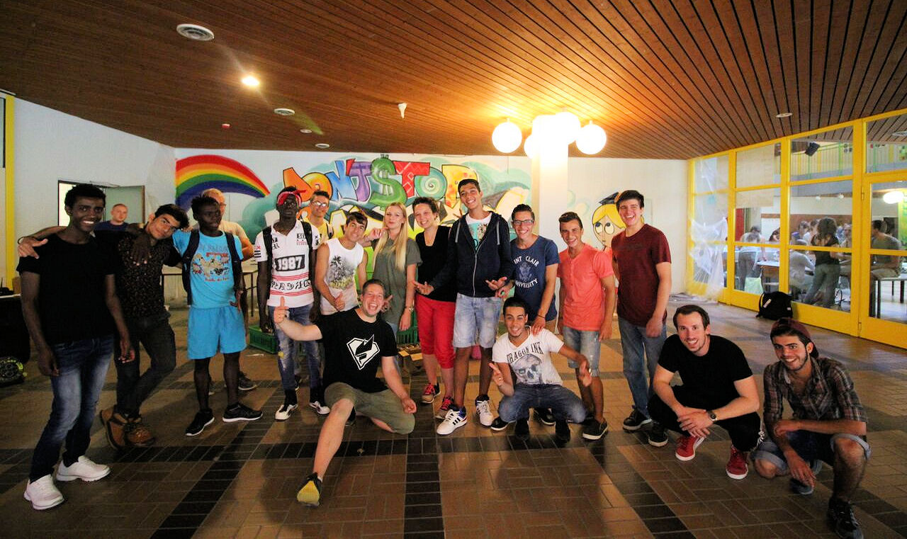 Nach dieser Gemeinschaftsaktion mit den jungen Flüchtlingen der Lea Wertheim ist die BEA in Hardheim als nächster Projektstandort an der Reihe. Gemeinsam mit Jugendlichen der CVJM-Ten-Sing-Gruppe aus Wertheim wird mit jungen Flüchtlingen aus Syrien und dem Irak, sowie aus Eritrea eine triste Kasernenwand und Trafostation in ansprechend-kreative Graffiti-Kunstwerke umgestaltet.