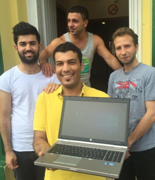 Stellvertretend für alle Bewohner der „Linde“ nahmen Ramez Almohamad, Saif Younus Khalid, Bilind Khammo und Moutaz Samour die Spende entgegen. Saif Younus Khalid, der vor seiner Flucht im Irak Informatik studiert hat, wird die Verantwortung für den Laptop übernehmen, der künftig allen Bewohnern zur Verfügung steht.