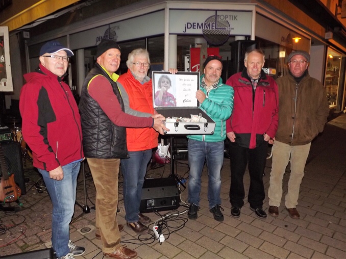 Und dann kam der Moment, an dem Robert Sauer, Dieter Uhrig, Willi Haas, Michael Laule und Norbert Johann den Spendenkoffer an Celines Großeltern Ute und Werner Schilling überreichen durfte. Der Koffer enthielt – zu aller Überraschung – einen Betrag von 1.246,53 Euro. Zudem überbrachte Dietrich Müller noch zwei Kuverts, die von Spendern, die anonym bleiben wollten, im Modehaus Müller abgegeben worden waren. So kamen weitere