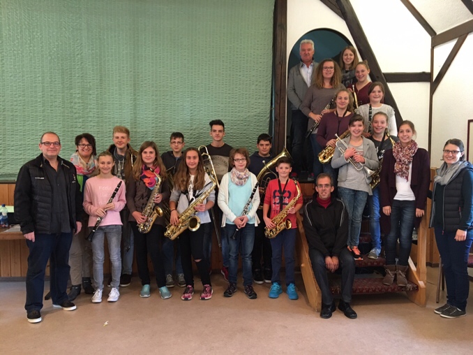 Das Bild zeigt die Jungmusikerinnen und Jungmusikern zusammen mit den Prüferinnen und Prüfern des Musikvereins Höpfingen Holger Dörr, Kerstin Schuh, Anna Kuhn, Helena Schell, Michael Kaiser, Gerd Hartmann, Elmar Schmitt und Jasmin Schmitt.