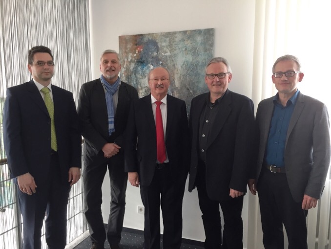 Unser Bild zeigt von links: Bernd Heß (Städtische Musikschule Walldürn), Michael Diedrich (Musikschule Mosbach), Sparkassendirektor Gerhard Stock, Tobias Soldner (Musikschule Eberbach) und Michael Wüst (Joseph-Martin-Kraus-Musikschule Buchen). (Foto: pm)