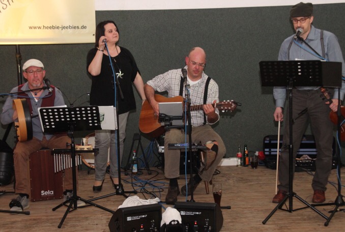 Ein „Must have“ waren natürlich das echte Guinness und andere irische Biere vom Fass oder der traditionelle Whisky bei dem akustischen Genuss, den die „Heebie-Jeebies“ gestalteten. So hatten die Gäste kein Problem, die Sperrstunde eines normalen irischen Pubs um einiges zu überschreiten. Wie dem Background der Band mit Martin „Mike“ Müller, Michael „Mikel“ Pascuzzi, Tina Czemmel-Zink und Franz Lechner zu entnehmen war, bedeutet “It gives me the heebie-jeebies” in etwa “Dabei bekomme ich eine Gänsehaut” und beschreibt ein Grundgefühl der vier Musiker wenn sie ihre Musik machen.