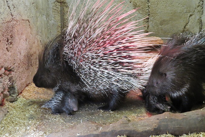 Gute Nachrichten gibt es auch bei den Stachelschweinen: Hier gab es gleich dreifachen Nachwuchs. Mit etwas Glück erwischt man den Moment, wenn die Kleinen flink über die Anlage flitzen – meist kurz nach der Stachelschweinfütterung, die täglich um 15 Uhr stattfindet. Die kleinen Stachelträger nutzen dann die Gelegenheit, wenn alle Stachelschweine draußen sind, auch einmal die Außenbereiche zu erkunden. Optisch sehen sie wie eine Mini-Version ihrer Eltern aus. Die erwachsenen Stachelschweine lassen ihre Jungen dennoch kaum aus den Augen und so kehrt die kleine Familie auch immer rasch in den geschützten Innenbereich ihres Geheges zurück.