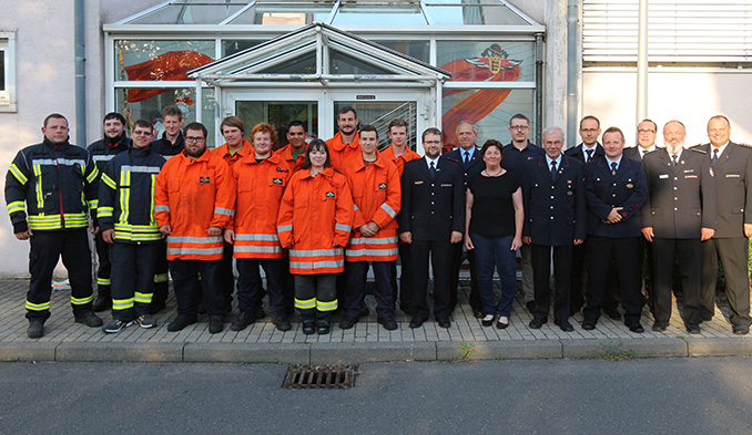 13 Teilnehmer der Feuerwehren Buchen, Limbach, Mudau und Ravenstein erhielten ihre Teilnehmerurkunden von Bürgermeister-Stellvertreterin Ruth Weniger und vom stellvertretenden Kreisbrandmeister Thomas Link.