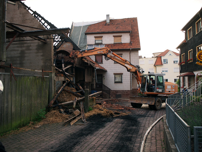 Gemeinsam mit dem Eigentümer beschloss die Feuerwehrführung um Gesamtkommandant Michael Merkle das Gebäude mittels eines Baggers der Firma Vogel abzureißen um dann weitere Glutnester auszuschließen. Anschließend übergab Merkle die Einsatzleitung an den stellvertretenden Abteilungskommandant der FFW Waldkatzenbach, Sebastian Dietz. Auch die HvO der DRK Waldbrunn und Bürgermeister Markus Haas waren anwesend.