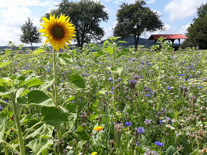 In der Samenmischung, die von den Biers ausgebracht wurde, gibt es neben Blumen wie Sonnenblumen, Klatschmohn, Ringelblumen, Kornblumenblau, Saatwicken, Perserklee und Büschelschön auch Kräuterpflanzen wie Dill, Koriander, Fenchel und Borretsch. Ein Strauß ist daher nicht nur schön fürs Auge, sondern auch lecker für den Magen.