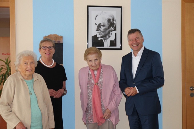 Erika Eisenhuth (links) und Hilda Zimmermann mit Hausleiterin Christa Stumpf und AWO Geschäftsführer Peter Maurus vor dem Bild der AWO-Gründerin Marie Juchacz. (Foto: pm)