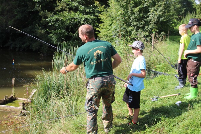 Seckach. (lm) „Petri Heil“ hieß es am Seckachweiher für 18 Kinder, die bei herrlichem Sonnenschein gespannt darauf hinarbeiteten, ihren ersten Fisch zu fangen. Sie zeigten dabei eine Geduld, die eigentlich nicht unbedingt prädestiniert für Kinder ist. Doch das Angelglück meinte es gut und ließ nicht lange auf sich warten. Unter der praxisnahen Anleitung von Alexander Göttlicher, Klaus Jantschek, Tobias und Colin Hoffmann sowie Stefan, Christian und Antonia Alter vom Sportanglerverein Seckach zappelte bei allen in relativ kurzer Zeit ein Rotauge oder eine Forelle am Haken.