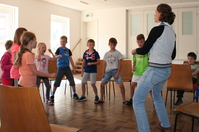 Nachdem sich herausgestellt hatte, dass eine aufrechte und stabile Haltung wohl die idealste ist, verwandelten sich die Kids nacheinander in die unterschiedlichsten Instrumente. Da erklangen Posaune, Cello, Geige, Klavier und Metallophon und wurden von den Kindern kreativ ausprobiert. Als Band arrangierten sie sich, wobei jeder nun sein Lieblingsinstrument verkörpern oder auch singen durfte.