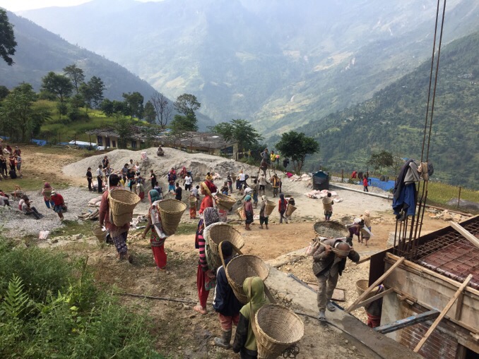 Im Anschluss reisten sie mit dem Bus in das abseits vom Tourismus, nahe an der tibetischen Grenze liegende Gati. Die letzte Stunde mussten sie zu Fuß zurücklegen, doch auf halber Strecke erwartete sie eine Überraschung. 250 Schüler und das gesamte Dorf wartete bereits zwei Stunden auf sie, um sie mit Musik, Jubel und Unmengen an Blumenkränzen zu empfangen. „Es war unglaublich. Ich habe Gänsehaut bekommen“ beschreibt Marco Grasberger den Moment. In Gati angekommen schliefen die Schüler in Gastfamilien. Kaum jemand hatte nach dem Erdbeben das Geld sein Haus wieder aufzubauen und so wohnten die Kinder mit der Familie gemeinsam in sehr einfachen Behelfsunterkünften aus Wellblech. Der Schulbau in Gati kommt gut voran und so haben die Schüler geholfen das Dach zu betonieren. „Man stellt sich das recht einfach vor, jedoch geschieht dies ohne Baugeräte. Der gesamte Beton wird handgemischt und in Körben den Berg hinauf auf das Dach getragen. Eine unglaubliche Leistung“, so Lehrer Daniel Schäfer. 150 Helfer aus dem Dorf und alle Schüler und Betreuer halfen mit.