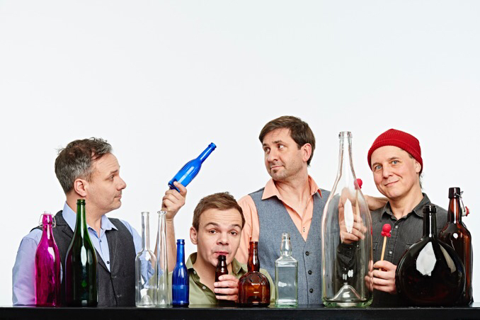 „GlasBlasSing“ sind zweifellos die Meister des Upcycling – der Umwandlung eines scheinbar nutzlosen Gegenstandes in einen höherwertigen. Dazu brauchen die vier Vollbiermusiker am 14. April in der Alten Schule nur einen Kasten leere Sprudelflaschen und eine Bühne voll anderer pfandwürdiger Getränkebehältnisse. Daraus entstehen erstaunliche Allround-Instrumente, die wie Schlagzeug, Bass, Gitarre, Flöte oder auch Steeldrum klingen. Die vier Jungs von „GlasBlasSing“ bieten auch im aktuellen Programm „Flaschmob“ ihre faszinierende Flaschenmusik, erweitert durch perfekten Satzgesang und äußerst unterhaltsame Performance. Sie verwandeln den Getränkemarkt zum Konzertsaal und die Pulle zur magischen Klangschatulle, mit der sich so einige dahinwelkende Melodien leichthändig generalüberholen lassen. Immer nach dem Motto: Bitte ein Hit.