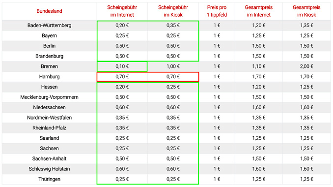 Sparen können Hamburger Spieler etwa, wenn sie in das benachbarte Nordrhein-Westfalen fahren. Dort belaufen sich die Lottokosten für ein Feld auf dem Schein auf lediglich 35 Cent. Damit sind sie gerade einmal halb so teuer wie ein Ticket in der Hansestadt. Auch in Rheinland-Pfalz ist das Ticket für 35 Cent erhältlich. Noch günstiger kann etwa in Bayern, Baden-Württemberg und Thüringen gespielt werden. Dort werden pro Feld auf dem Lottoschein 25 Cent fällig.