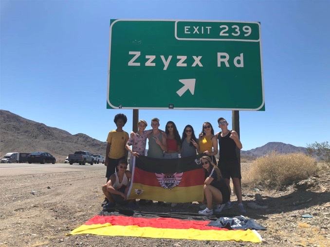 Am Highway zwischen Las Vegas und Los Angeles liegt in der kalifornischen Mojave-Wüste die Ausfahrt Zzyzx. Der kuriose Name auf dem Schild war Namensgeber für die Gruppe Zzyzx. Stehend v.l.: Moses Schäfer, Danny Winterholler, Leon Meixner, Katrin Pinneker, Ilayda Altinkaya, Anastasia Lindegrün, Luis Jakob, hockend v.l.: Max Wisner, Isabell Pinneker (Foto: pm)