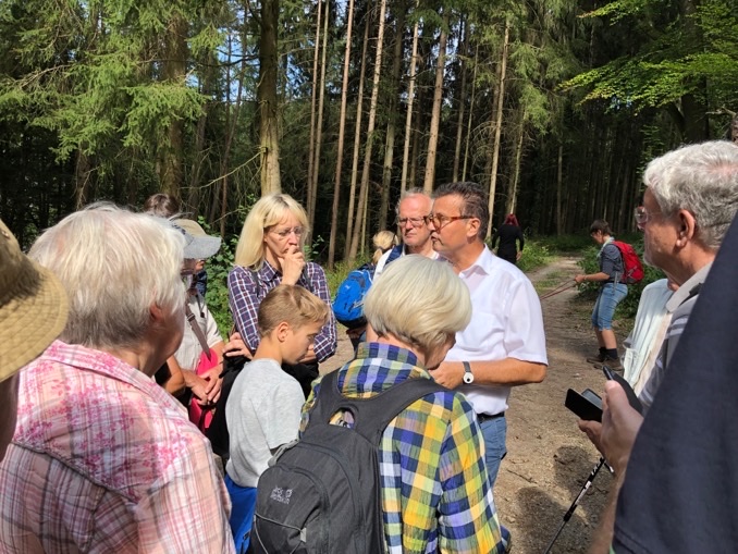 So ging der Minister besonders auf den stellenweise explosionsartigen Borkenkäferbefall ein. Anhand von fundierten Zahlenbeispielen machte Hauk deutlich, wie schnell und extrem sich ein solcher Befall ausweiten könne. Unter den Mitgewanderten befanden sich auch selbst einige Waldbesitzer, die sich Sorgen über ihren Waldbestand machen, welcher ebenso teilweise von Dürreschäden oder Borkenkäferbefall betroffen ist.