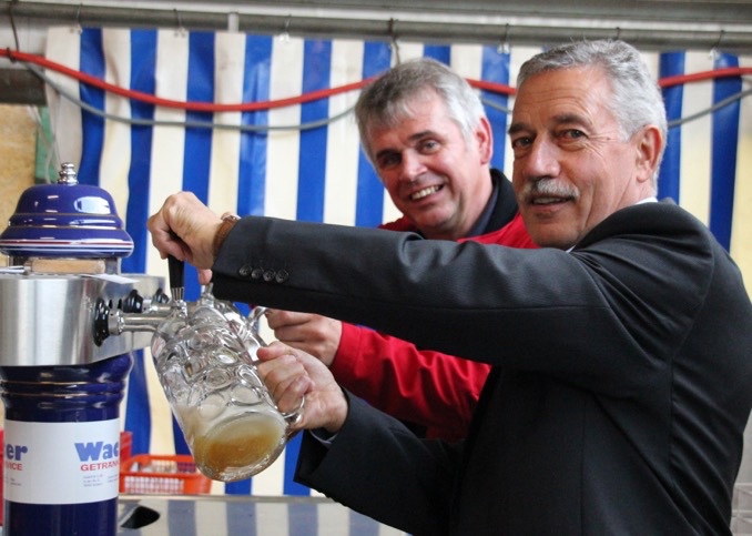 Abteilungskommandant Cornel Schwab und Ortsvorsteher Klaus Schork meisterten den Anstich synchron für Fest- und Bockbier, was der zweitägigen Geburtstagsfeier bereits einen gemütlich bayrischen „Geschmack“ verlieh, der sich am Festabend mit Haxen und am Festsonntag mit Weißwürsten noch intensivierte.