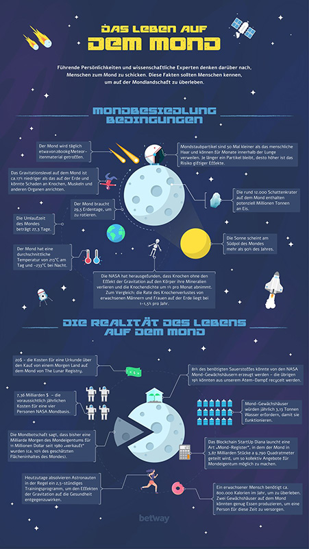 Neben den baulichen Fragen lässt ein Blick auf die Lebensbedingungen und -umstände auf dem Mord die Frage aufkommen: Warum sollte ein Aufzug zum Mond überhaupt gebaut werden? Zwar wird der Nachbarplanet als mögliche Alternative und potenzieller Zweitlebensraum in Betracht gezogen, doch Betway zeigt, dass tägliche Meteoritenschauer und unmenschliche Temperaturen zwischen 213° und -233° ein normales Leben unmöglich machen. Ein Lift auf den Mond wäre aktuell nur für Forschungszwecke relevant. Eine dauerhafte Alternative ist diese Lösung allerdings nicht.
