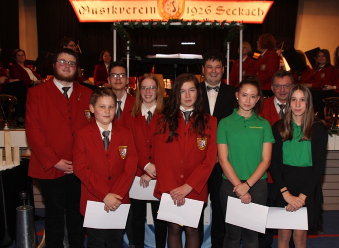 erhielten das Jungmusikerleistungsabzeichen in Bronze Nele Hoffert und Leonie Urban sowie in Silber Bastian Hoffert, Sky Magbanua, Pauline Winkler, Meret Huber und Isabel Mornhinweg. (Foto: Liane Merkle)