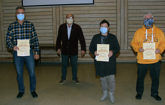 Ehrungen für besonders treue Mitglieder sprach Hubert Sämann aus, auch wenn Umstände bedingt nicht alle Ihre Urkunden entgegennehmen konnten. Für 25 Jahre treue Zuverlässigkeit wurden Eleonore und Norbert Schnetz, Gudrun und Norbert Nesnidal, Harald und Marion Roos, Hildegard Schnörr, Edelgard Coates sowie Brigitte Knäble mit Urkunde und Präsent ausgezeichnet. Seit 25 Jahren begleitet Trudbert Mechler das Amt des 2. Vorsitzenden, wofür er mit der Verdienst-Ehrenurkunde, einem Präsent und einem Dankeschön-Blumengruß für Ehefrau Marianne von Hubert Sämann in seiner Funktion als 1. Vorsitzender gewürdigt wurde.