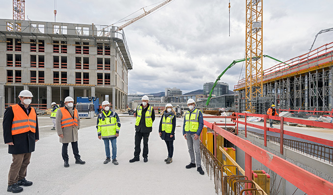 Nach eineinhalb Jahren Bauzeit wächst das neue Stadtentree Heidelbergs immer weiter in die Höhe: Kai M. Dreesbeimdiek, Geschäftsführer der Gustav Zech Stiftung Management GmbH führt Oberbürgermeister Prof. Dr. Eckart Würzner (2.v.li.), Ersten Bürgermeister Jürgen Odszuck (li.), Dr. Ernst Baader und Andrea Krastel vom Landschaftsamt sowie Gerald Dietz (v.li.), Leiter Geschäftsstelle Bahnstadt, über die Baustelle. (Foto: Philipp Rothe)