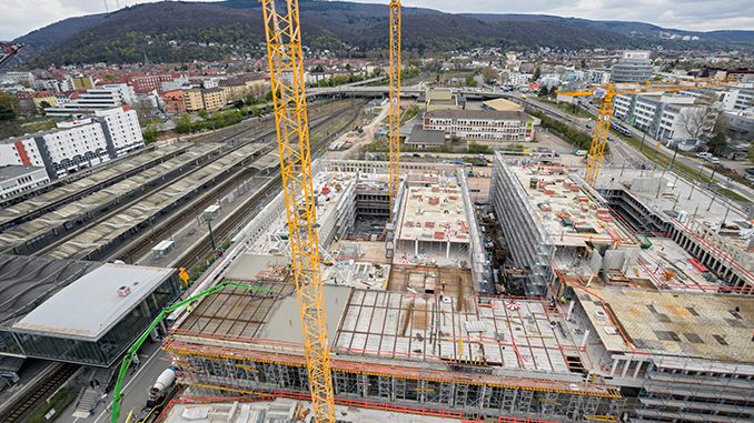 Heidelberg. (pm) Direkt am Heidelberger Hauptbahnhof entsteht ein neues Stadtentree. Nach eineinhalb Jahren Bauzeit sind der neue Europaplatz und sein Ensemble aus fünf Gebäuden deutlich zu erkennen.