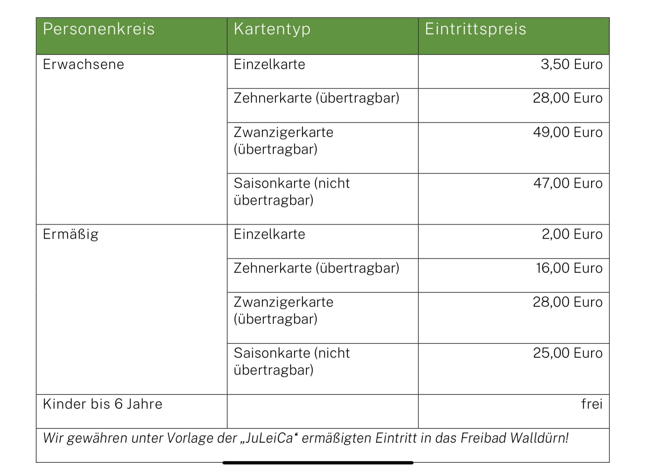 Eine grundlegende Änderung zum Pandemiebetrieb des Vorjahres gibt es dennoch. So werden in diesem Jahr nicht nur Einzelkarten oder Saisonkarten verkauft, sondern auch wieder übertragbare Zehner- und Zwanzigerkarten. Die Mehrfachkarten können dabei auch noch im Folgejahr eingelöst werden. Diese besucherfreundliche Tarifsystematik ist heuer ein absolutes Alleinstellungsmerkmal des Walldürner Freibades. Sollte das Bad pandemiebedingt schließen, ist eine Rückerstattung für die Saisonkarte allerdings nicht möglich.