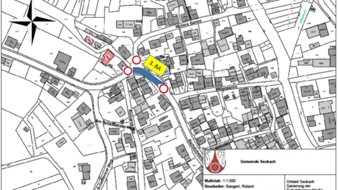 Seckach. (pm) Nach dem Ende der Bauferien der Fa. Demirbas beginnen am 16. August die Arbeiten am Kanal im Bereich der Einmündung der Hinteren Gasse in die Eicholzheimer Straße (siehe Planauszug).