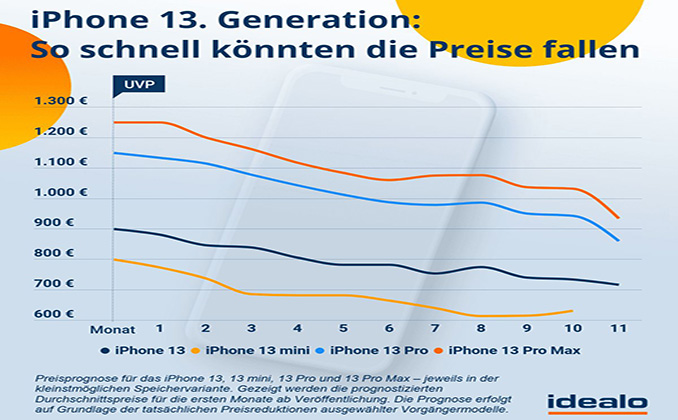 Auf Basis der Vorgängermodelle prognostizieren die Idealo-Experten bereits vier Monaten nach Verkaufsstart deutlich gesunkene Preise. So könnte das iPhone 13 dann bereits 11 Prozent günstiger in den Shops erhältlich sein.