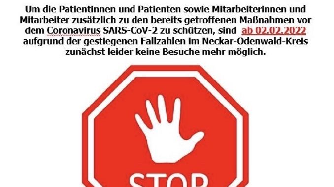 Mosbach/Buchen. (pm) Während für viele Kliniken in der Region seit Monaten ein Besuchsverbot besteht, konnten die Neckar-Odenwald-Kliniken bisher Besuche unter 2G+-Regeln ermöglichen. Aufgrund der dramatisch gestiegenen 7-Tage-Inzidenz sehen sich die Verantwortlichen jetzt gezwungen, bis auf weiteres ein Besuchs- und Begleitungsverbot auszusprechen, das am Mittwoch, 02. Februar in Kraft tritt.