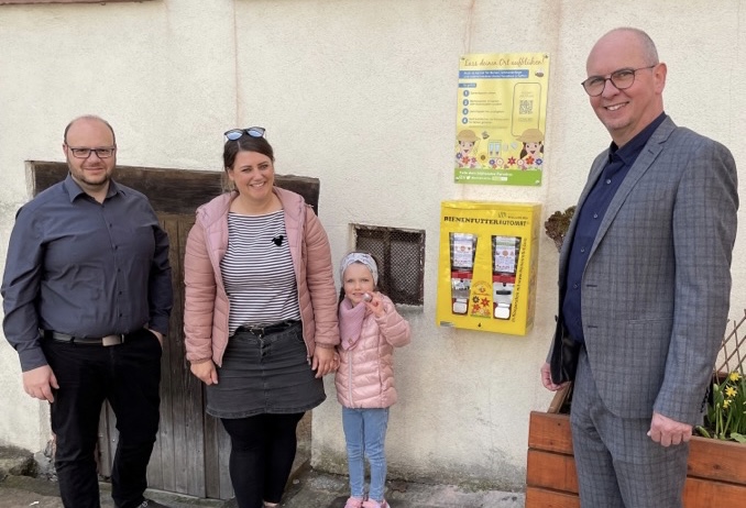 Am Dienstag durften Mia und ihre Mutter Catharina Rakowitz den ersten Bienenfutterautomaten im Landkreis in Betrieb nehmen. Mit dabei anwesend waren Bürgermeister Markus Günther und Stabsstellenleiter Meikel Dörr.
