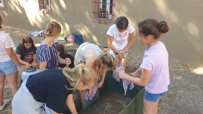 So dürfen sich die SchülerInnen beispielsweise bei der Station „Kleider machen Leute“ mit historischen Gewändern in Schale werfen und für Fotos zu posieren. „Da blickt man in begeisterte Gesichter“, stellt der stellvertretende Schulleiter Achim Wawatschek bei seinem Besuch fest und freut sich über das rege Interesse der Teilnehmer, die bei aller Begeisterung an der Waschstation leidvoll erfahren müssen, dass Fleckenentfernung im 19. Jahrhundert mit Waschbrett und Kernseife harte körperliche Arbeit war.