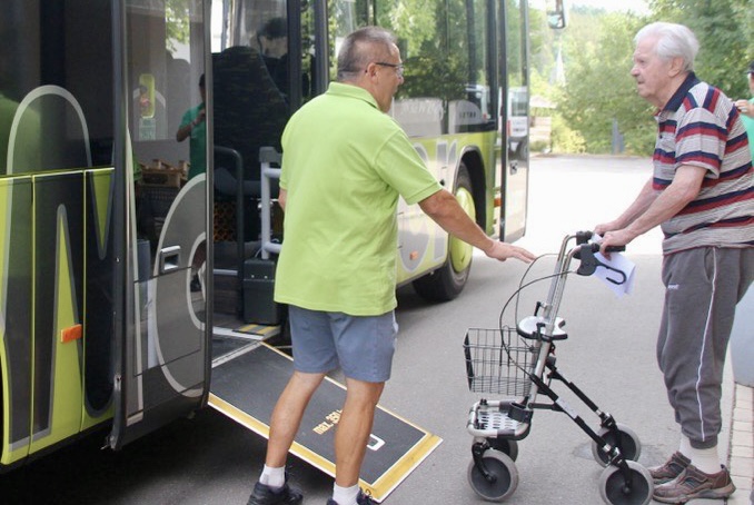 Nach Theorie und praktischen Übungen gab es dann die Rollator-Königsdisziplin. Ein Bus fer Firma Mechler-Reisen parkte direkt neben dem Übungsgelände. Fahrer Peter Koestner klappte eine Rampe aus, sodass „Fahrschüler“ einsteigen üben durften. Danach galt es, den Rollator an einem sicheren Stellplatz zu sichern und einen festen Sitzplatz zu suchen. Wer dann noch den Ausstieg bewältigt hatte, bekam den ersehnten Rollator-Führerschein.