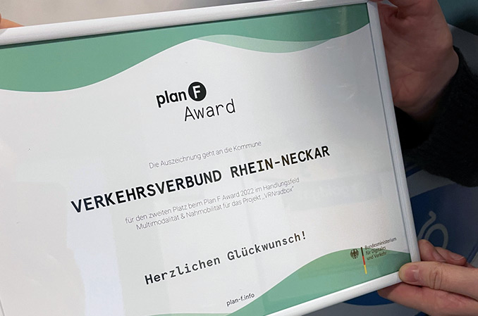 Metropolregion. (pm) Mit dem Projekt VRNradbox hat der Verkehrsverbund Rhein-Neckar (VRN) den zweiten Platz des Plan F-Awards in der Kategorie „Multimodalität und Nahmobilität“ gewonnen. Bei dem Wettbewerb ging es um kommunale Radverkehrsförderung.