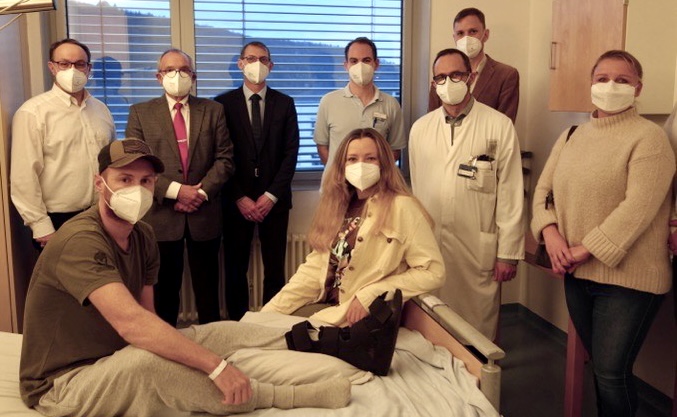 Wieder vereint: Hanna Mechenkova und ihr Mann Serhii Mechenkov. Der DRK-Kreisverband Mosbach organisierte den Transport des im Krieg Verwundeten von der polnisch-ukrainischen Grenze, die Neckar-Odenwald-Kliniken koordinieren seine weitere Behandlung. Das Bild zeigt die Eheleute mit von links DRK- Kreisgeschäftsführer Steffen Blaschek, Gerhard Lauth, Präsident des DRK-Kreisverbands Mosbach, NOK-Kliniken-Geschäftsführer Frank Hehn, Physiotherapeut Alexander Uhler, Chefarzt Dr. Bernd Gritzbach, Integrationsmanager Florian Küchler und Vera Bissinger. Sie und ihr Mann Heiko Bissinger nahmen Hanna Mechenkova und ihre beiden Töchter nach Kriegsausbruch bei sich in Wagenschwend auf. (Foto: pm)