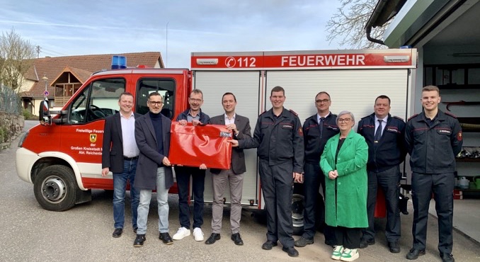 Unser Bild zeigt von links: Bürgermeister Patrick Rickenbrot, Versicherungsvertreter Tunay Göc, Horst Frei und Jens Richter, Abteilungskommandant der Feuerwehr Reichenbuch Maximilian Schoder, Kommandant der Feuerwehr Mosbach Detlev Ackermann, Ortsvorsteherin Heike Roth, feuerwehrtechnischer Angestellter Nico Spohrer und Jugendbetreuer Philipp Schoder. (Foto: pm)