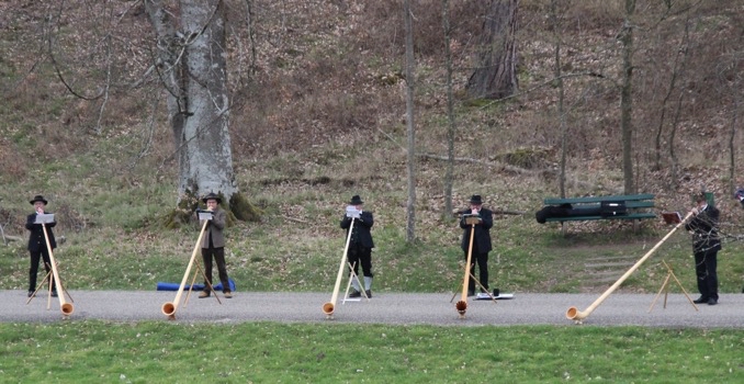 Neben traditionellen alpenländischen Werken aus der Schweiz wie „Hirtenruf“, „Morgentau“ und „Abendruhe“ umfasst ihr Repertoire aber auch Polkas, Landler, Walzer und Märsche, die vom Fuß des Schloßparks zu seinem Publikum erklangen. Diese Werke – überwiegend Allgäuer Herkunft – ermöglichten ein breites Klangspektrum, das man von diesen gigantischen Musikinstrumenten nicht erwartet.