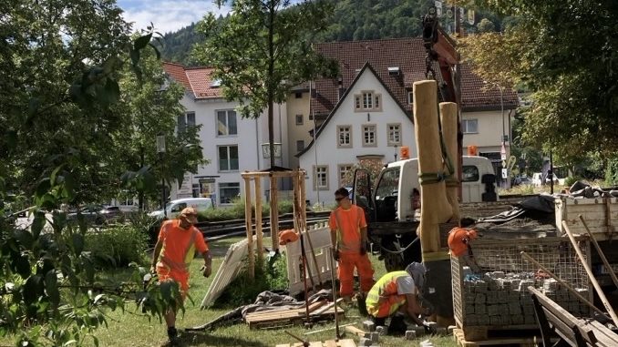 Mitarbeiter des städtischen Regiebetrieb Gartenbau errichteten am 5. Juli 2023 die Gedenkstele im Frieda-und-Mathias-Müller-Park in Ziegelhausen. Die Stele erinnert an das Ziegelhäuser Ehepaar und bietet Interessierten weitere Informationen zum Leben und Wirken der Müllers. (Foto: pm)