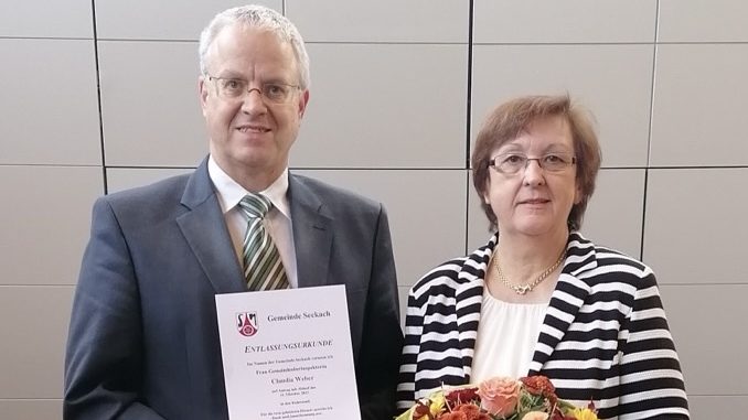 Claudia Weber war seit dem 01. Januar 1977, also 45 Jahre und zehn Monate im Rathaus beschäftigt und gehörte praktisch zum lebenden Inventar des Seckacher Rathauses. Der Rathauschef betonte die große Lücke, die nun im Team fehlen werde. Ludwig brachte aber auch die Hoffnung zum Ausdruck, dass sie zusammen mit Ehemann Wilfried den lang ersehnten „dritten Lebensabschnitt“ hoffentlich lange genießen kann.