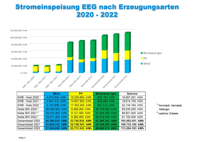 Die vielen Photovoltaikanlagen im Stadtgebiet haben eine Leistung von rund 31.216 Kilowatt (kW). Weil Wind und Sonne keine konstante Leistung liefern können, unterstützt eine Biogasanlage mit 75 kW und ein Biomassekraftwerk mit 7.325 kW deren unregelmäßige Stromeinspeisung mit „grundlastfähigem“, das heißt konstant erzeugtem Strom.