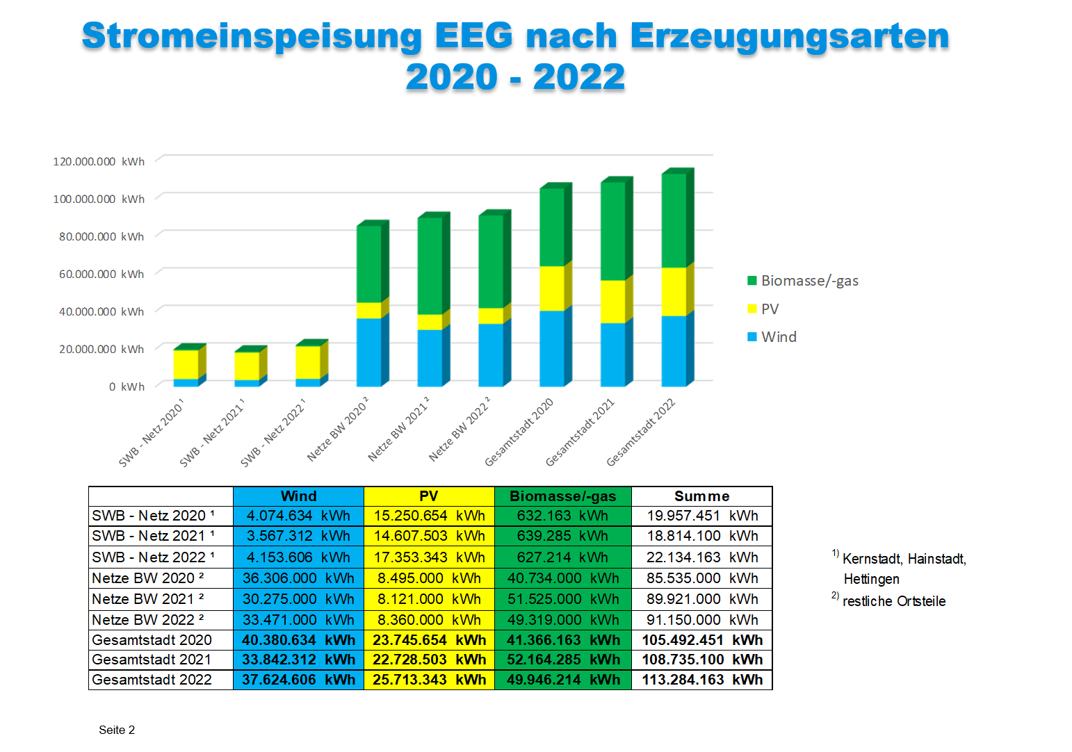 Insgesamt wurden im Jahr 2022 also insgesamt 113.284.163 kWh regenerativer Strom (33 Prozent Wind, 44 Prozent Biomasse, 23 Prozent PV) gemäß dem Erneuerbare Energien-Gesetz erzeugt. Dem gegenüber steht ein gemessener Gesamtverbrauch von 78.309.788 kWh (private Haushalte, Handwerk, Landwirtschaft und Industrie).
