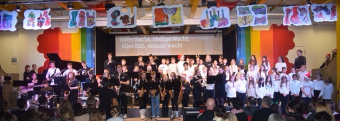 Die Piccola Banda mit dem Chor der Klassen 5b und 6b unter der Leitung von Verena Hart und ihrem „Come and Blow, Winter Wind“ von Joachim Fischer aus Helbing, eröffneten vor vollem Haus das Weihnachtskonzert. Nach der Begrüßungsansprache von Schulleiterin Regina Krudewig-Bartel folgte die Kiddies Band mit dem Evergreen „Feliz Navidad“ von José Feliciano. Jazzig – italienisch wurde es mit der Saxophongruppe „O du fröhliche“ mit einer Melodie aus Sizilien. Mit „Alle Jahre wieder“ von Friedrich Silcher und „Ich steh an deiner Krippen hier“ von Johann Sebastian Bach schlossen sich die nächsten Lieder an, die in der Vorweihnachtszeit nicht fehlen dürfen.