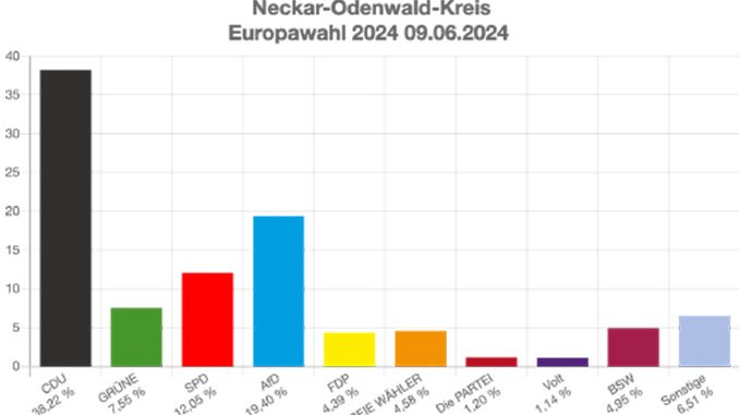 Die Wahlhelfer in den 186 Wahlbezirken im Neckar-Odenwald-Kreis haben die Stimmen der Europawahl 2024 komplett ausgezählt. Die detaillierten Ergebnisse zeigt die folgende Tabelle. Die Wahlbeteiligung liegt bei 66,12 Prozent. Der Wahlausgang der einzelnen Wahllokale bzw, Gemeinden finden sich im Internet.