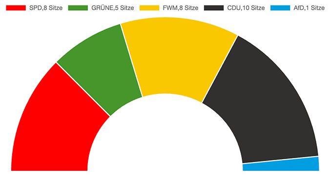 Dadurch ergeben sich zehn Sitze für die CDU, jeweils acht für die FWM und die SPD, die Grünen gewannen fünf Sitze und die AfD erhält einen Sitz.