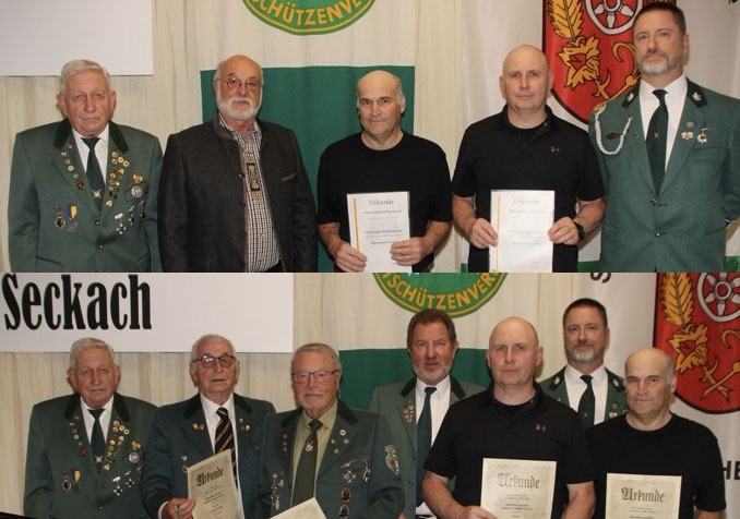 Friedbert Großkopf vom Badischen Sportschützenverband hatte neben lobenden Worten für die tolle Schießanlage die Ehrenmedaillen des Badischen und des Deutschen Sportschützenbundes im Gepäck, Magnus Müller vom Badischen Sportbund Nord e.V. erinnerte an die zahlreich erfolgten Zuschüsse des Sportbundes, die für diverse Neuanlagen und Erweiterungen der Seckacher Sportstätte aufs Positivste genutzt worden waren und überreichte eine Urkunde zum 100. Geburtstag.