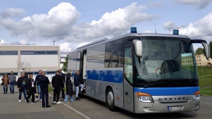 Auf einem Rundweg durften sich die “Tagesgäste” die Gegebenheiten vor Ort anschauen. In der Gefängnisschule wurden Lernangebote und m Aktivitäten des Gefangenensports sowie des Freizeitbereichs vorgestellt. Ein besonderer Blickfang waren die Gefangenentransportbusse, vor allem der mit Reise-Zellen ausgebaute große Reisebus, der rechtskräftig verurteilte Jugendstrafgefangene aus ganz Baden-Württemberg ins Bauland bringt.