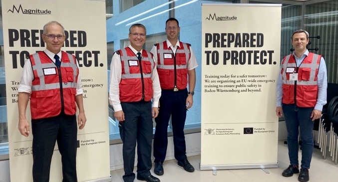 Mosbach. (pm) Die europäische Katastrophenschutzübung Magnitude hat begonnen. Dafür sind Kreisbrandmeister Jörg Kirschenlohr und Christoph Raabe von der Stabsstelle Feuerwehr und Bevölkerungsschutz aus dem Neckar-Odenwald-Kreis gemeinsam mit Bezirksbrandmeister Jürgen Link und René Hundert vom Regierungspräsidium Karlsruhe diese Woche zunächst nach Stuttgart gefahren. Im Rahmen der groß angelegten Übung werden vom 24. bis 26. Oktober europäische Kräfte im Neckar-Odenwald-Kreis eintreffen und das Szenario eines Erdbebens üben.